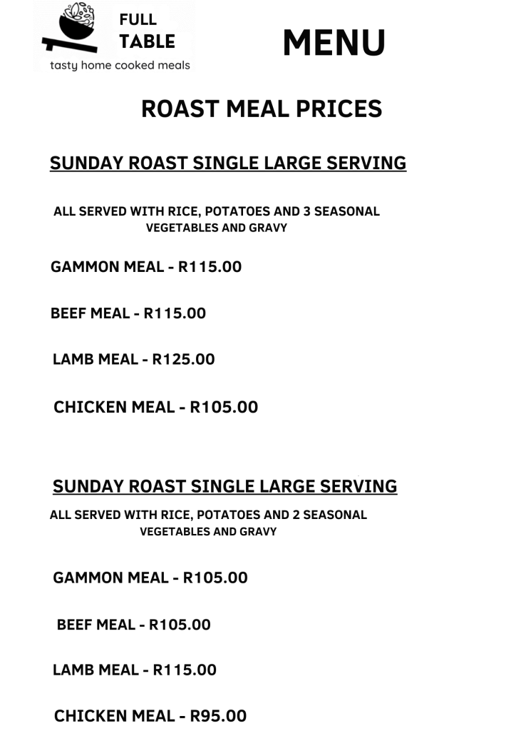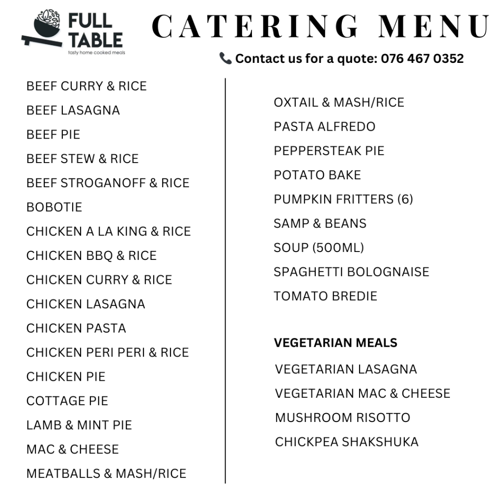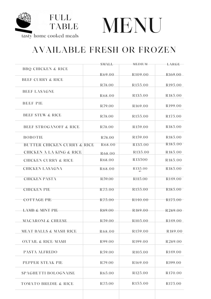 Please note: The frozen meal menu is the same as our fresh meal menu. Fresh meal menu referring to meals served fresh in the shop daily. The choice of fresh meals served varies daily so be sure to head to our Instagram and Facebook stories to find out what the menu for the day is. Alternatively pop us a call or WhatsApp on 076 467 0352.